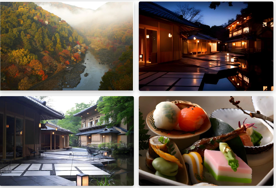 - 특징: 전통과 현대가 조화를 이룬 고급 료칸으로, 강변에 위치하여 아름다운 자연 경관을 감상할 수 있습니다. 각 객실은 세련된 일본식 디자인으로 꾸며져 있으며, 프라이빗 온천과 정통 가이세키 요리를 제공합니다.